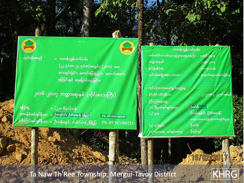 This photo was taken on February 16th 2017 in B--- village, Ta Naw Th’Ree Township, Mergui-Tavoy District. This photo shows the sign board of the Department of Burma/Myanmar government road construction project. The sign board states the following information: The Burma/Myanmar Government Department of Road Construction is responsible for leading the road construction project; the project budget is 80,500,000 kyat [US $59,278.35] for paving the road and 220,640,000 kyat [US $162,474.22] for dumping the soil from the construction; the period of the project is 2016-2017; the distance of the road is between 22.5 km and 24.5 km. The sign board also lists the names of the engineers, township administrators, village tract administrators, department of development administrator and village leaders involved in the road construction project. [Photo: KHRG]