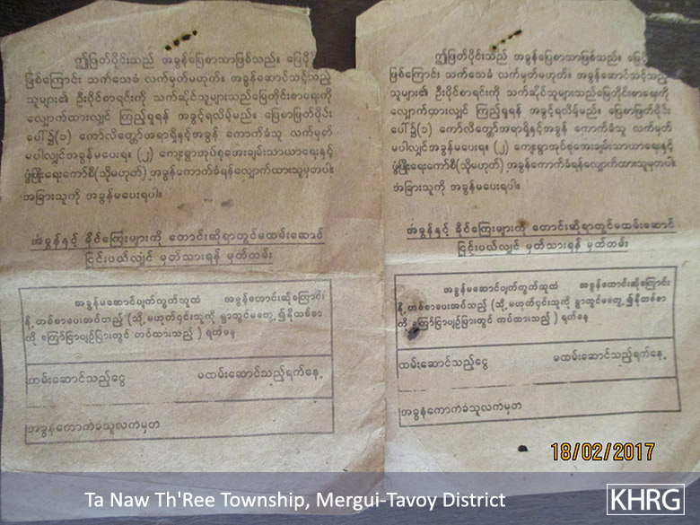 [7] After further follow up after this interview, KHRG researchers learned that Saw A--- does not have a land title for his land but only a land tax receipt. In this interview, he incorrectly referred to his land tax receipt as a ‘land title.’