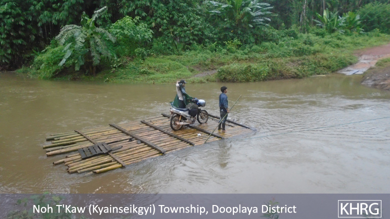Some villagers in Noh T’Kaw Township, Dooplaya District face transportation challenges during the rainy season because there is no bridge [to cross the river] from Noh Taw Plah village and Meh K’La village to other villages. There is a bridge across the T’May Klo river in Chaw Wa village, T’Hka Klo village tract, Noh T’Kaw Township, Dooplaya District.