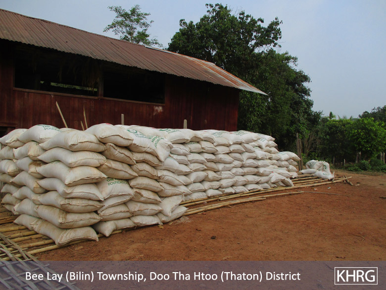 This picture shows paddy rice about to be distributed to villagers. On March 23rd 2016, it was distributed to Wa Khaw Hta, La Kyoh Hkaw Htee, La Kyoh Hkoh, Ta Meh Hkee, Suh Hkee, Baw Naw Hkee [villagers in] Noh Ber Baw village tract, Bilin Township. None of the representatives from the Nippon Foundation came [for the paddy distribution]. Only village tract leaders and responsible people distributed the paddy. [Photo: KHRG]
