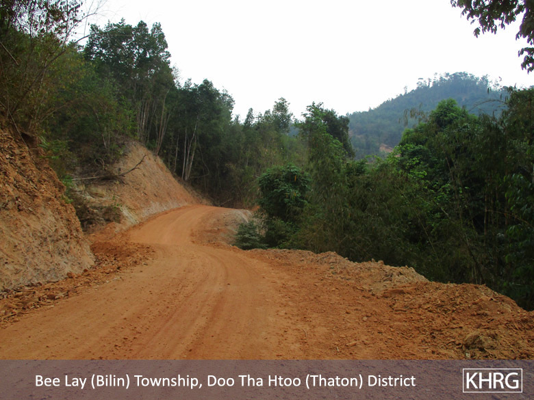 This picture was taken on April 20th 2016. It shows a road that was constructed from Na Kgyi village, through Khaw Htee Hkee village, to Peh Wa Hta village, and up through a mountain to Lay Kay village. U Ye Tun Company built the road between 2014 and 2015, and completed it in the summer season. The picture was taken on April 20th 2016. It is a new road in Bilin Township. [Photo: KHRG]