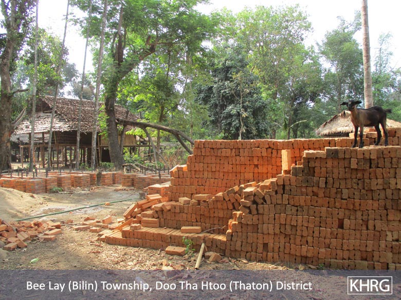 This photograph was taken on April 10th 2016. This photo shows a primary school being built in Kwee Lay Tha Wa Pya, Noh Ber Baw village tract, Bilin Township, Doo Tha Htoo [Thaton] District. I [KHRG community member] do not know who funded this school, but the people who led [the project] were Saw A’Ngeh (a trader from Htee Pa Doh Hta village) and Brigade (#1) Adjutant General Aee Tha (IDB) director. [Photo: KHRG]