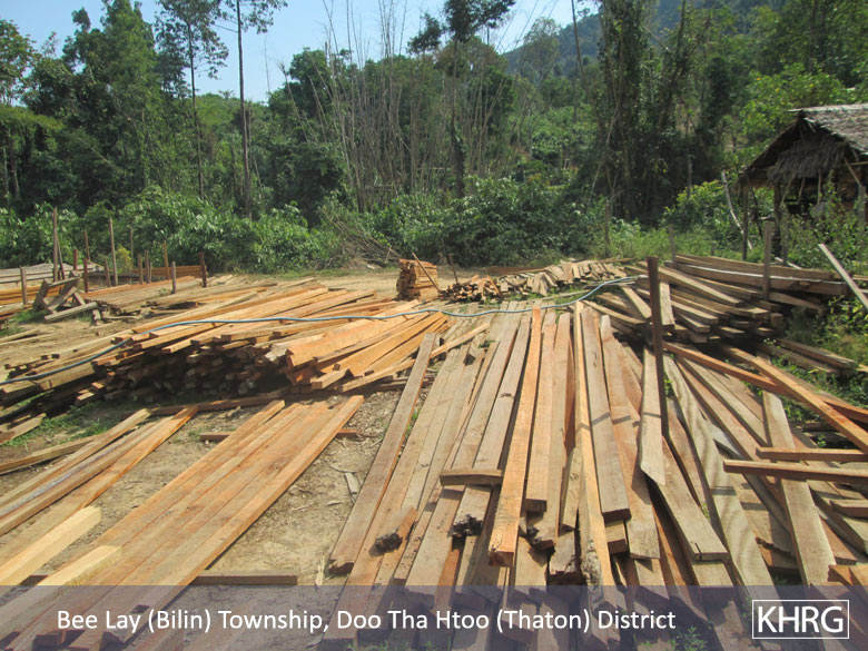 Regarding this issue, Adjutant General Aee Tha and Saw A’Ngeh Lay took responsibility to lead [this project]. They will build very cheap toilets in three villages, such as Htee Lay Kaw village, P’Yah Raw village tract, and Htee Ber Hkee village, Htee Hsee Baw village tract. I went to Htee Lay Hkaw village and saw the villagers have not built houses yet [for IDPs to return]. I told them, “The rainy season will come soon, why have you not built your houses?” The person who [will implement this project] is Saw A’Ngeh Lay, but even by April 15th 2016 the trees [for building the houses] had not been cut down yet. In order to build houses for Internally Displaced People, Adjutant General Aee Tha came up with the idea to cut down the trees from Toh Teh Hkee Forest and Ta Auh Hkee Forest. The total [weight] of the trees cut down will be 600 tonnes. The villagers from Toh Teh Hkee village did not want to permit them to take the logs but the KNU leader came to take it, therefore they agreed with the leaders.