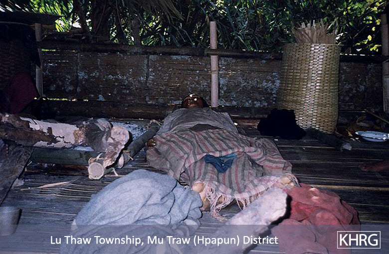 [24] “The health situation for the internally displaced villagers is very serious. There is no medicine in the Ywa Bone villages and they are completely dependent on traditional medicines made from roots and leaves. Without  letters of recommendation it is impossible to send people to Kler Lahor Toungoo for treatment. Twenty displaced people from Ha Toh Per village died from diarrhoea in 1999, simply due to a lack of basic medicines.” PEACE VILLAGES AND HIDING VILLAGES: Roads, Relocations, and the Campaign for Control in Toungoo District,”KHRG, October 2000; see also “ABUSES AND RELOCATIONS IN PA’AN DISTRICT,” KHRG, August 1997; “Papun and Nyaunglebin Districts, Karen State: Internally displaced villagers cornered by 40 SPDC Battalions; Food shortages, disease, killings and life on the run,” KHRG, April 2001.