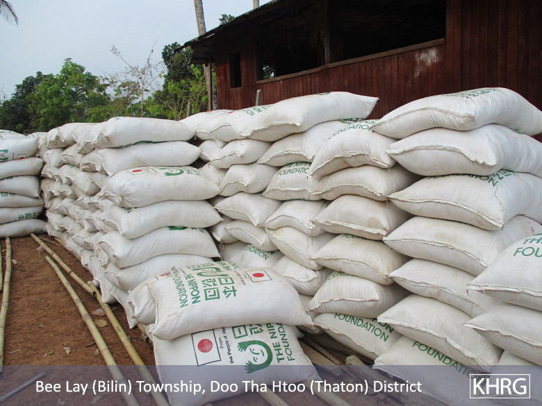 The first pictures show paddy rice distribution to villagers. On March 23rd 2016 it was distributed to Wa Khaw Hta, La Kyoh Hkaw Htee, La Kyoh Hkoh, Ta Meh Hkee, Suh Hkee, Baw Naw Hkee [villagers in] Noh Ber Baw village tract, Bilin Township. None of the representative from Nippon Foundation came [for paddy distribution], it was only done by village tract leaders and other responsible people.