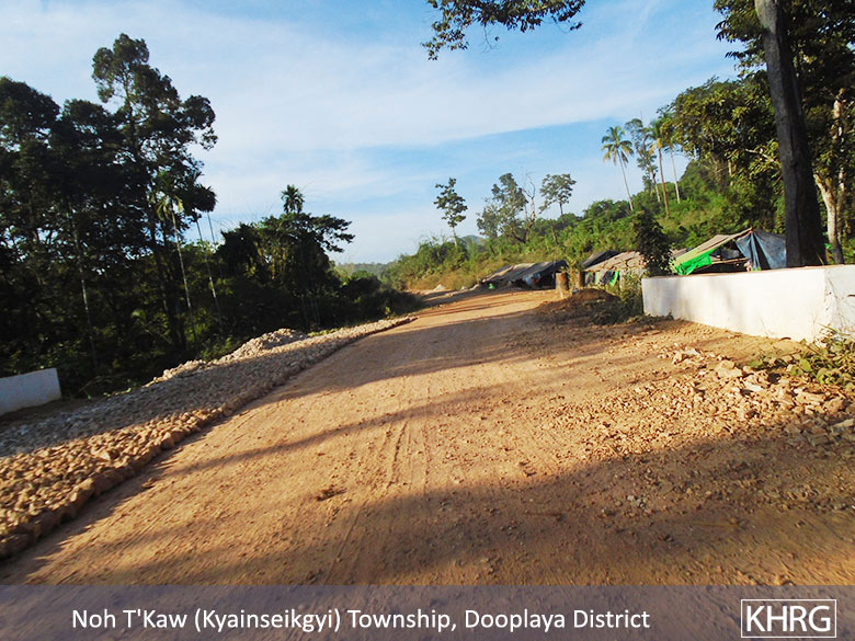 On December 19th 2017, in Noh T’Kaw [Kyainseikgyi] Township, Dooplaya District, local people faced livelihood challenges because of the road construction project conducted by the Man Myit Hein Company. The road construction project between Khoh Ther Pler and Kyainseikgyi started in 2013 and has not yet been finished. The person responsible for the project is a wealthy individual named U Khin Zaw who had a contract [for road construction] with the Burma/Myanmar government. U Khin Zaw is Mon ethnic person who lives with his family in Kyainseikgyi Town. His representative was U Htun, a Tatmadaw Commander who also lives in the same town. U Htun manages the road construction process conducted by U Khin Zaw [Man Myit Hein Company].