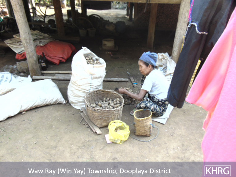 Business and social conditions have not changed between November 19th 2017 and February 8th 2018 in Kyainseikgyi and Win Yay townships, Dooplaya District. The prices of products are rising but the prices of raw material are decreasing. In 2017 and 2018, the price of rubber lowered to 550 kyats [$0.41][10] per one pound. Therefore, local people did not plant rubber but planted other plants after clearing all the rubber trees. The price of sesame and betel nut is good in some places but low in other places. The price of betel nut in Win Yay Township is 25 kyats [$0.02] per one nut but in some places in Kyainseikgyi Township the cost of betel nut is only 15 kyats [$0.01] per one nut. Local people are facing difficulties as the prices of raw products are fluctuating. Consequently, local people had to rely on the forest to produce