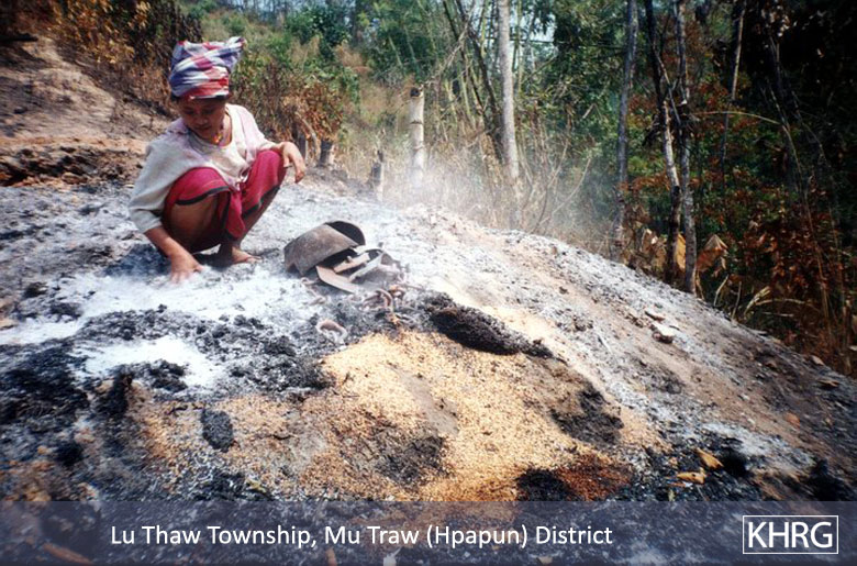 back and secretly taker ice from our rice barn. We also had to clear new hill fields in order to survive. We didn’t have much time to cut down the forest for our hill fields so we could only clear a small area. We couldn’t do more than that because we had to build new houses... We could only clear an area in which we could plant just two or three big tins [25 kg/55 lb to 37.5 kg/78 lb] of paddy seed.” Burma Army attacks and civilian displacement in northern Papun District,” KHRG, June 2008.