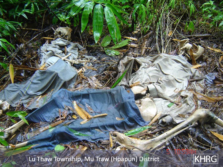 [59] “The villagers they shot were Per Taluand Pa Mu Dah [both men]. They were Taw Oak villagers. One was 15 years old and the other was 34.… Four of us had gone to look for vegetables. On our way back, we didn’t know that the Burmese soldiers had come to our village. They had already laid some landmines on the path, but none of us stepped on them. Then we saw the smoke  of a farm hut that they had set on fire, but we thought they wouldn’t do anything to us because we’re only villagers. Suddenly we saw a soldier carrying a gun, and I knew he was a Burmese soldier. I started to run and he shot at me, so I fell down and lay quietly even though I wasn’t injured. Then he shot at my friend and hit him, but he wasn’t badly wounded and ran right on past me. Then the Karen soldiers started shooting at them, and the Burmese shot dead my other 2 friends. … They took the bags of the 2 dead people and took some of their vegetables and the squirrels they’d caught to eat. Then they burned the bodies and the rest of the vegetables with some scrap wood. After that they laid landmines around the bodies, so that nobody would dare go to remove them. Later another villager went to the place where the bodies were, and he died because he stepped on one of the mines. After that the Burmese captured another Taw Oak villager and executed him too because they accused him of being a KNU spy.” UNCERTAINTY, FEAR AND FLIGHT: The Current Human Rights Situation in Eastern Pa’an District,” KHRG, November 1998.