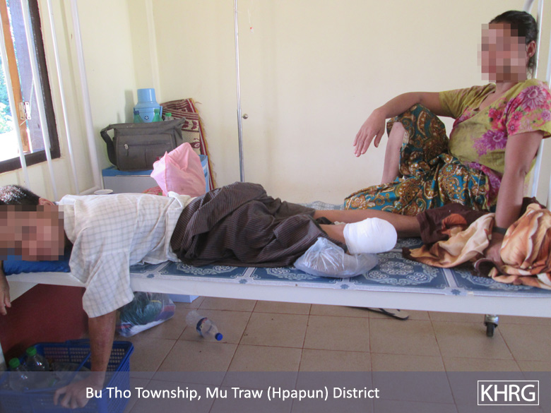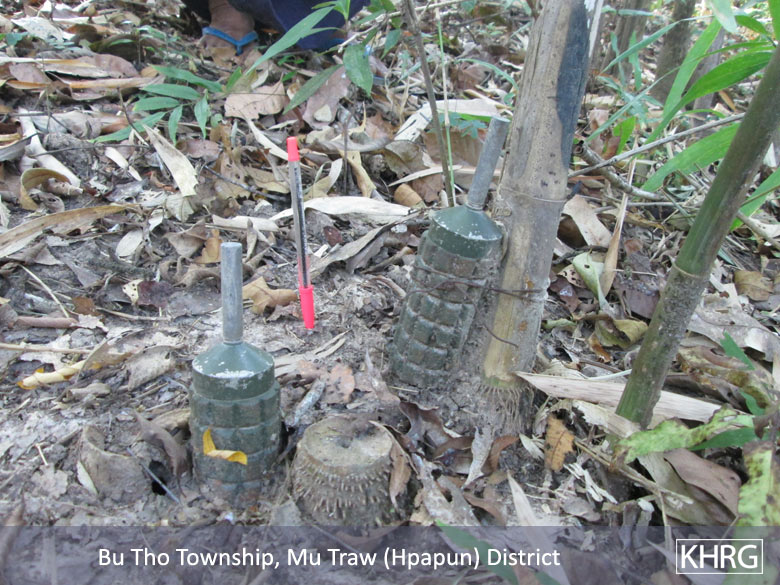 [64]“In February 2012, KNLA Battalion #101 and Border Guard Battalion #3 worked together following an order to remove the landmines.Those who came and removed the landmines were Border Guard   Company Commander Hpah Maw Hkoh, with Sergeant Kee Kyaw, Private Htwee Heh Kay and Battalion Deputy Commander Maung Ngway Heh, and they managed it with 20 of their soldiers. With regards to the KNLA, 2nd Lieutenant K’Loo Koo and Hpah Htwee Maw managed it with about 15 soldiers. Some of the village heads accompanied them.They were able to remove 30l and mines altogether. At 3:00 pm on that same day, February 11tha Border Guard soldier named Htwee Heh Kay was hit by one of their own landmines; because of that, the removal of landmines was stopped.” Pa’an Situation Update: T'Nay Hsah Township, September 2011 to April 2012” KHRG, July 2012; see also “Hpapun Situation Update: Bu Tho Township, June 2016 to August 2016,” KHRG, November 2016.