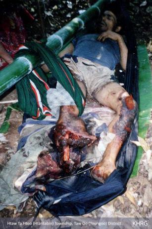 [103] “Aftermorethana month, four of us tried to run away at night when the soldiers weren’t looking. They didn’t see us, but in the dark we ran into another group of soldiers and porters. They fired a grenade at us. [Note: The weapon used appears to have been a launched grenade fired from the end of a modified rifle.] It hit us. I just saw my friend Pa Deh fall dead, and then I fell unconscious. I don’t know how long I was asleep. When I woke up it was still dark and Pa Deh’s body was there. He was 26 years old. I never saw what happened to my other two friends. There was a lot of blood coming from my head but I didn’t feel any pain yet. I got up and ran away. I got back to my village, and they took care of me and brought me across to the Mae Sot hospital in Thailand.” THE CURRENT SITUATION IN MUDRAW (PAPUN) DISTRICT,” KHRG, November 1992.