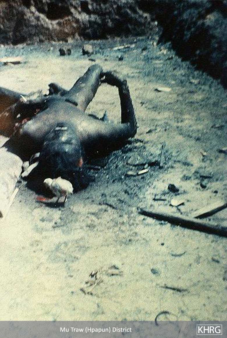 “On March 3,1994, soldiers from SLORC [Tatmadaw] Infantry Battalion #35 (based in Kyaukkyi) entered Paw Mu Der village. They found photos in Saw Gay’s house showing a man in Karen uniform, so they accused Saw Gay of having a relative in the Karen Army and ordered him to explain. Afterwards they took him in front of the whole population of the village, including his wife and 2 children (aged 4 and 2), and cut off his arms and legs. They left him bleeding on the ground for 2 hours, but he was still not quite dead so they cut off his penis, then cut open his belly and ripped out his internal organs.”