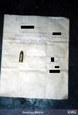 While, there are examples of threats connected to development projects preceding the preliminary ceasefire,[37] most of the examples of threats show that they were a military tactic by Tatmadaw and, at times, DKBA (Buddhist) and BGF. This use of threats as a military tactic is in clear violation of the Fourth Geneva Convention, which prohibits the use of intimidation against civilians during conflict.[38]  How Tatmadaw and DKBA (Buddhist) frequently issued threats was through message or order letter by both army camp commanders and battalion commanders. Order letters were sent via messenger (conscripted commonly as a form of forced labour) to the village head, with demands for immediate action and threats of consequence if the village head chooses not to adhere to the order.[39] For example, in 2006 the Tatmadaw ordered, in a series of letters, villagers living east of the Day Loh River, Toungoo District, to relocate; those villagers who chose to defy this order were sent chilli, charcoal and a bullet, to signify torture, village burning and death.[40] Despite these threats, villagers and village heads employed negotiation,[41] avoidance[42] or partial compliance to avoid the full severity of potential abuse.[43]