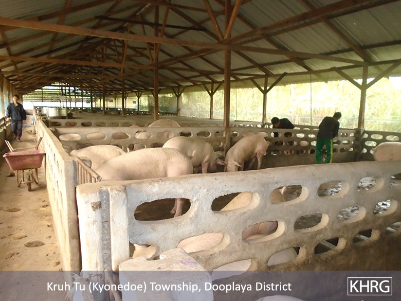 The Hplon Sgaw Hpoh Livestock company started operating in Htee Saw Shee Nee village, Htee Guh Thaw village tract, Kyonedoe Township, Dooplaya District on January 1st 2015. Its plans to operate its livestock business in the area until 2025. The company raises chickens and pigs on an industrial level. The owner of this company is Wee Cheer, who lives near Mae Sot, Thailand. The person who oversees the business activities is Ma Aye Myint who lives in Hpa Thi village, in Burma/Myanmar. The company’s practices are not sanitary. [KHRG has received reports that] the company does not dispose of the animals’ dung properly. Therefore, the dung spreads into the surrounding lands. Local villagers are worried that the dung will flow into their village and negatively affect their health during the rainy season. The strong smell of dung is already difficult for the local community. Some villagers have become ill from breathing the air. Even though the community has reported this situation to the Kyonedoe Township authorities, the Hplon Sgaw Hpoh company continues its unsanitary practices. In addition to this, the company constructed more buildings to raise livestock this year.Naw L--- and Naw H---, two local women, became sick. The villagers are worried for their own health [considering that the livestock farm will operate in the area] for the next 10 years. The villagers want the local leaders to advocate on their behalf in order to make the company raise their livestock in a sanitary manner.