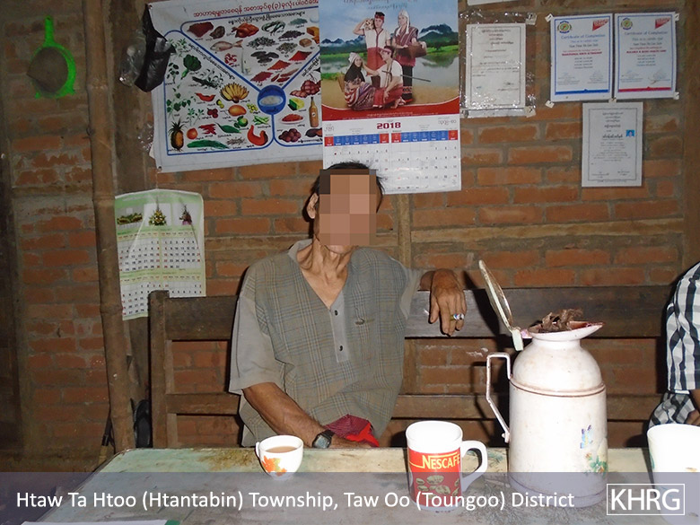 This photo was taken on November 11th 2017 in Co---village, Shauk Pin Chaung village tract, Htantabin Township, Toungoo District. This photo shows the interviewee Saw Cn--- who expressed about the land confiscation of Tatmadaw and the ministry of industry 1. Villagers were sued by the company when they confronted their ancestral lands. [Photo: KHRG]