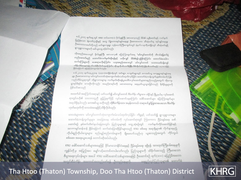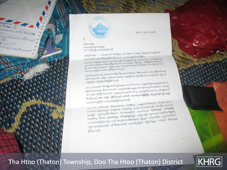 These photos were taken on June 17th 2017 in Q---village, Min Lwin village tract, Thaton Township, Thaton District. The first photo shows an interviewee Saw N--- who reported about limestone quarry project on Min Lwin Mountain and the local civilians' perspectives and concerns. The other three photos show a complaint letter that local civilians submitted it to Karen National Union (KNU) Central, District and Communication offices. This letter stated that civilians are not agree with the project and request the transparency on providing information about the project. [Photos: KHRG]