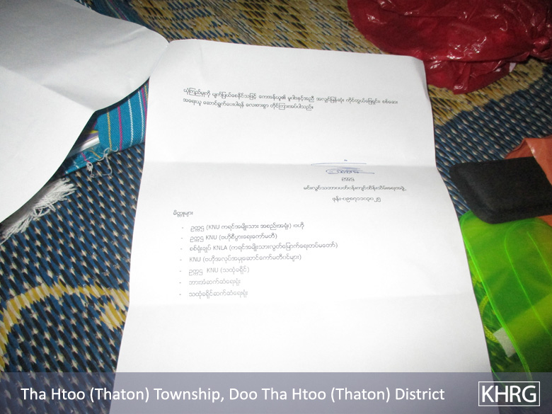 [Local people asked] the Burma/Myanmar government village and village tract administrators [about this survey] and they replied, “We won’t hand the [survey record list] paper to the company directly. We will keep it [the survey forms] with us first, then we will ask the perspective of the KNU village tract administrator and then we will send it to the company.”