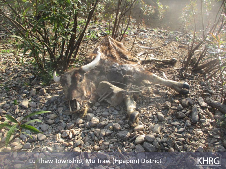 Notably, between January and February 2019 in Lu Thaw Township, Hpapun District, Tatmadaw soldiers based in the Paw Khay Hkoh, Keh Deh Kyoh and Kuh Hkoh army camps fired an estimate of 83 artillery shells in the vicinity of Ta Koo Der and Kuh Day villages and local civilians' farms. One of the civilians’ buffaloes died, another two were injured from the shrapnel. IDPs fled into the forest for their safety until February 2019 and were afraid to work on their farms or raise their livestock.[59]