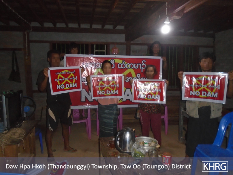 The photo on the left was taken on May 15th 2019 in Thandaunggyi Township, Toungoo District. It shows the signs that the villagers prepared to protest against the construction of the Thauk Yay Khat Dam (I). The photo on the right was taken on May 2nd 2019 in the same township. Over 20 villagers gathered together to share their perspectives on the Thauk Yay Khat Dam (1) and sign a document stating their opposition to the project. [Photos: KHRG]