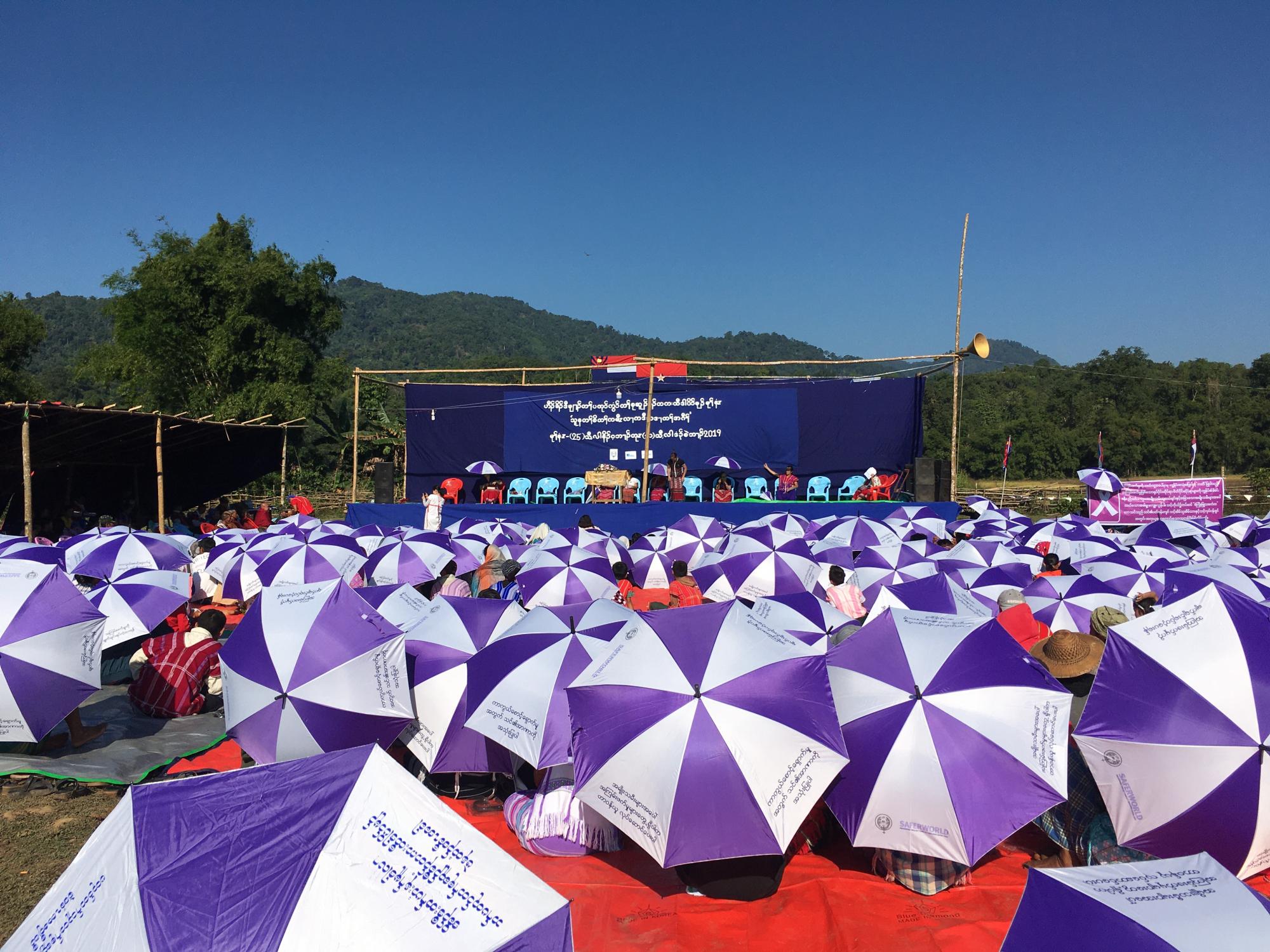 This photo was taken on November 25th 2019 in Dwe Lo Township, Mu Traw (Hpapun) District. It shows hundreds of villagers attending an event for the 16 Days of Activism against Gender-based Violence campaign organised by the Karen Women's Organisation (KWO). The slogans written on the umbrellas that were distributed to the villagers read: "Stop sexual violence now! Take action and be responsible if you see violence against women. Use your power to protect!" [Photo: KHRG]