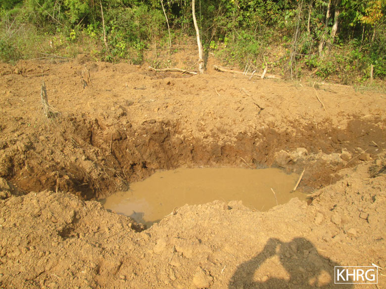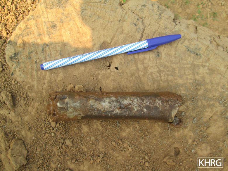 These photos were taken on January 31st 2020 in a farm owned by a community member from N--- village, O--- village tract, Bu Tho Township, Mu Traw District. The photo on the right shows one of the holes created by the destruction of old ammunition by the Tatmadaw. The photo on the left shows a fragment of ordnance that was not totally destroyed. [Photo: KHRG]