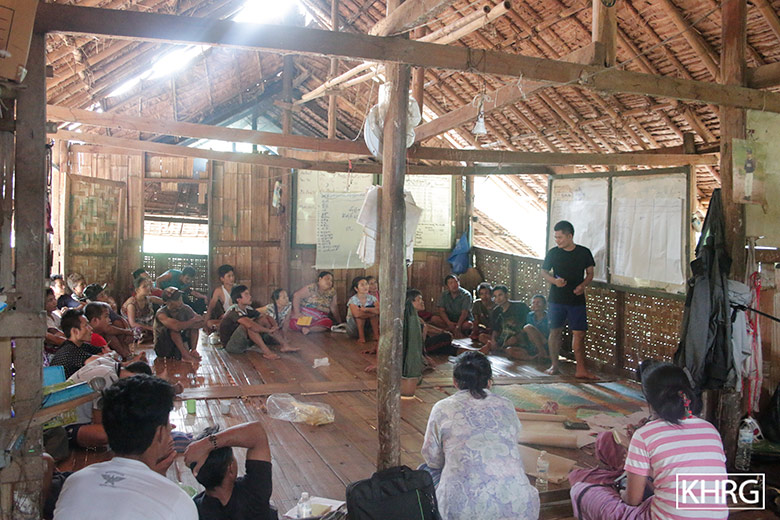 This photo was taken in Ei Tu Hta IDP camp, Bu Tho Township, Mu Traw (Hpapun) District on June 13th 2017. Ei Tu Hta camp committees, IDPs, journalists, and several CBO members (from KORD, KWO and KSNG) held a meeting in the camp hall to discuss how IDPs would return to Kler Lwee Htoo (Nyaunglebin) and Taw Oo (Toungoo) districts. [Photo: KHRG]