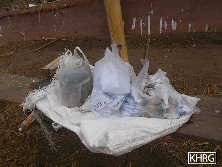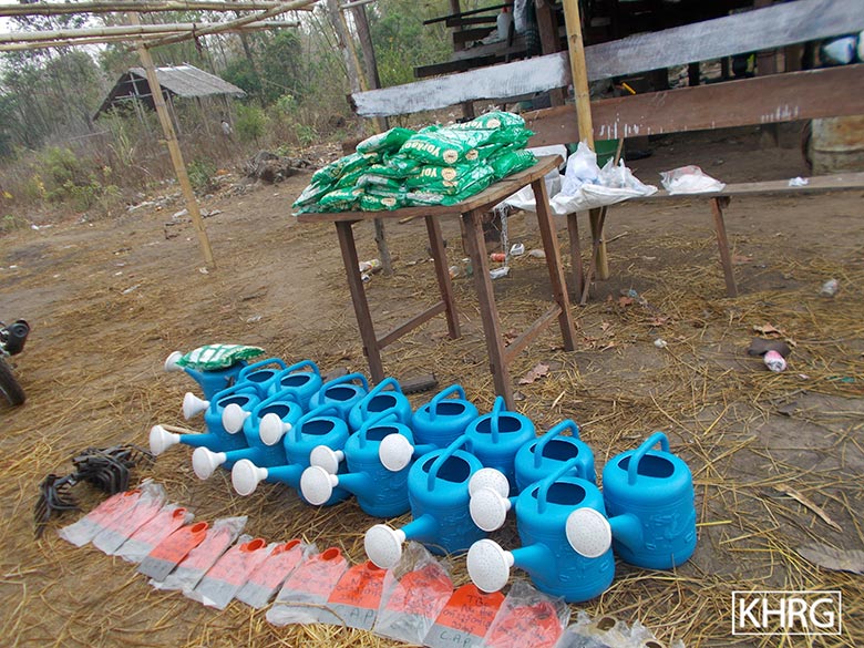 These photos were taken in March 2017 in Htee Nya Paw village, Noh T'Kaw (Kyainseikgyi) Township, Dooplaya District. They show the farming equipment, seeds and anti-mosquito insecticide provided to returnees by Noh Poe camp’s agricultural department, who also conducted a short agricultural training to help them rebuild their livelihoods in Myanmar. Many of the returnees interviewed by KHRG received similar training. [Photos: KHRG]