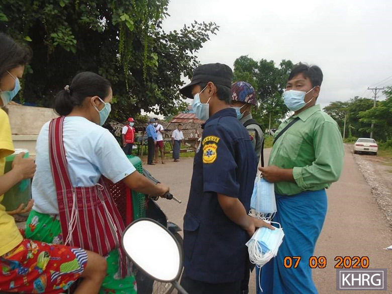 This photo was taken on September 7th 2020 in Noh T’Kaw village, Noh T’Kaw Township, Dooplaya District. It shows Myanmar government and health workers distributing masks to local villagers who travel on the road. [Photo: KHRG]