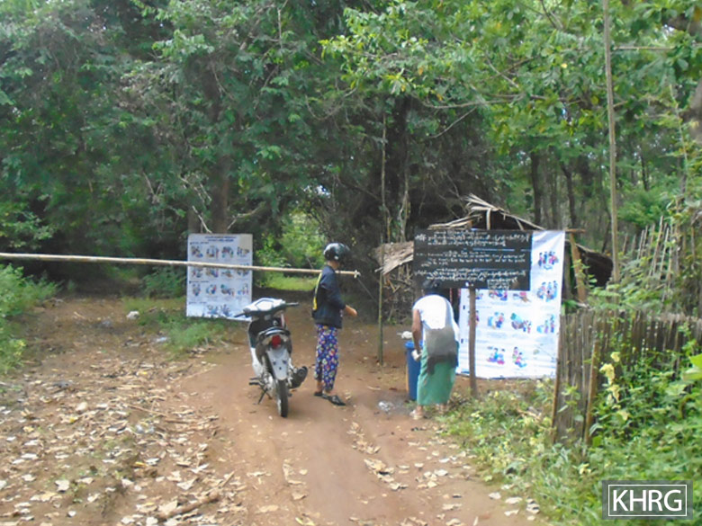 This photo was taken on October 9th 2020 in Wah Doh Klah village, Noh Nyah Lah village tract, Moo (Mone) Township, Kler Lwee Htoo District. The photo shows the COVID-19 screening checkpoint at the entrance of the village. Villagers are monitoring the screening checkpoint on a rotating basis. Outsiders are not allowed to enter into the village. [Photo: KHRG]