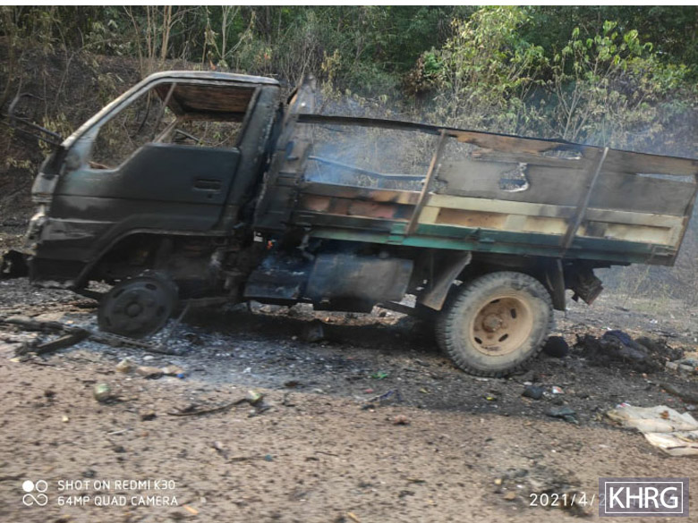 This photo was taken on April 23th 2021 beside the vehicle road near Chaw Bee Na and Kaw Ler villages, Kaw Ler village tract, Thaton Township, Doo Tha Htoo District. This truck owned by an unidentified villager from Kyeik Kaw Thein Seik town was destroyed during a skirmish between KNLA and SAC soldiers. The owner of the truck was killed in the crossfire. [Photo: Villager]