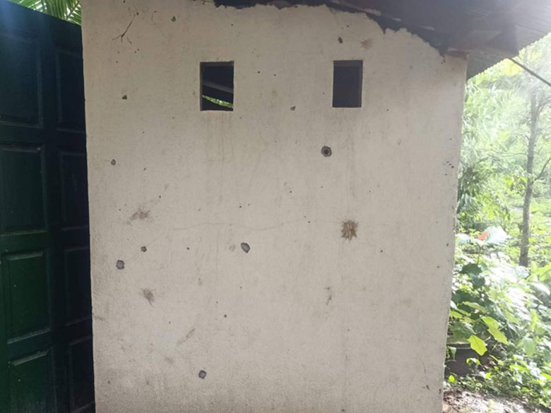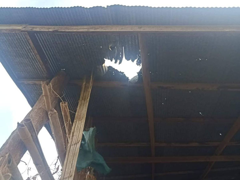 These photos were taken on June 3rd 2021, in U--- village, Kaw T’Ree Township, Dooplaya District. They show the damage to villagers’ houses that was caused by the firing of mortars and bullets. [Photos: local villager]