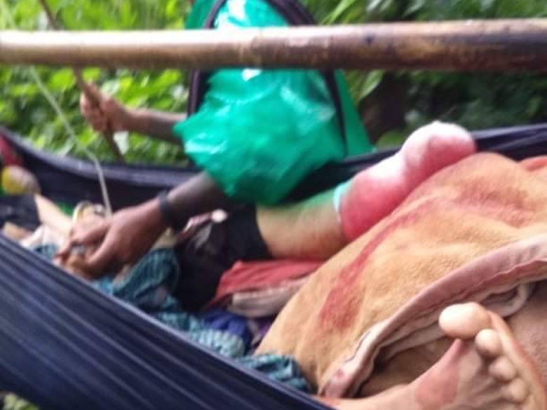 The first two photos (top) were taken on September 11th 2021 in Dwe Lo Township, Mu Traw District. The first two photos (top left and right) show Saw I---, who was injured in a landmine explosion, being taken to a KNU medic located in H--- village to treat his wounds. The photo on the bottom left shows Saw I--- being placed in the boat at O--- village on September 12th 2021 for transportation to K’Ma Moh Town. The photo on the bottom left shows Saw I--- in the car that took him to K’Mah Moh Town for further treatment. [Photos: Local villager]