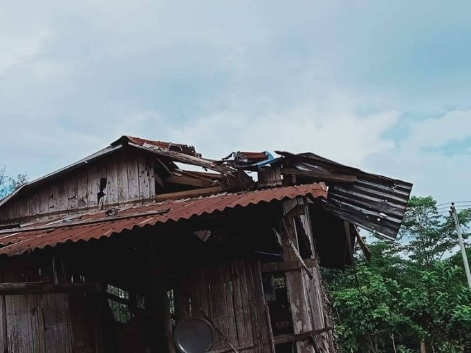 These photos were sent to KHRG by a local villager in D--- village, C--- village tract, Kaw T’Ree Township, Dooplaya District on October 12th 2021. The photo on the left shows a piece of a mortar found in D--- village, while the photo on the right shows the damage done to a local villager’s house by SAC shelling. [Photos: local villager].