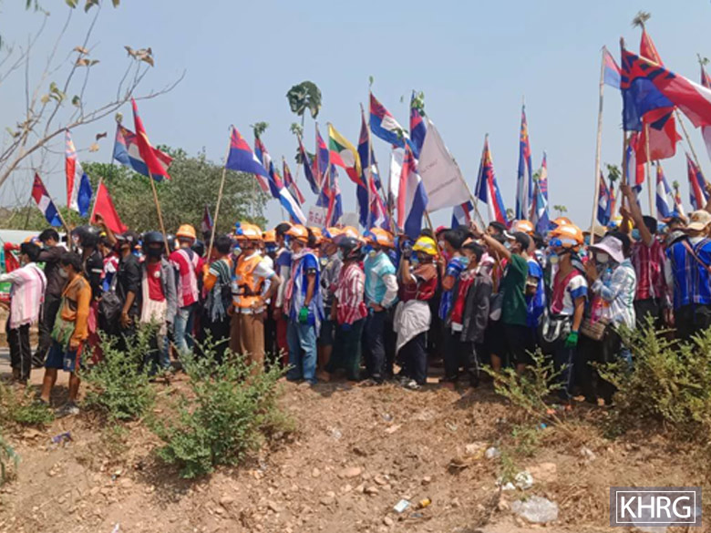 This photo was taken on March 9th 2021 on the Asia Highway near Kawkareik Town, Dooplaya District. It shows villagers protesting against the military regime. Over 9,000 villagers participated in the protest. SAC police and soldiers did not allow them to cross the highway and enter into town, so they had to remain on one side of the highway for their protest. [Photo: KHRG]