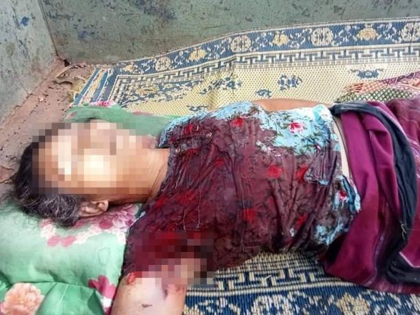 This photo was taken on February 18th 2022 in E--- village, Maung Ma Ywar Thit village tract, Kaw T’Ree Township, Dooplaya District. The photo shows a woman named Naw Pu Tin who died immediately after being hit by exploded mortar shrapnel during indiscriminate shelling in her village. [Photo: Local villager]