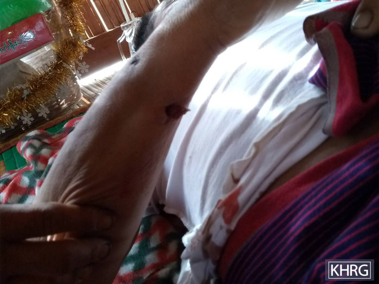 These photos were taken on May 24th 2022 in H--- village, Soo K’Lee village tract, Kaw T’Ree Township, Dooplaya District. The photos show Saw E---’s corpse and the wounds on his right wrist and left armpit from the bullets. [Photos: KHRG]