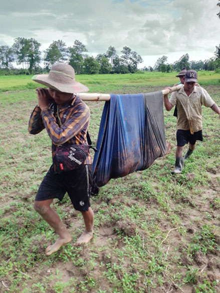 These photos were taken on September 22nd 2022 between Taung Su and A--- villages, Shwegyin Inn village tract, Moo Township. The photo on the left shows the corpse of Naw Thoo Lei Paw, who was killed by indiscriminate shelling fired by SAC LIB #351 based at Nant Thar Kwin Bridge [at the entrance to Taung Su village]. She was hit when she was returning from Taung Su village to the location where she was displaced. She had returned home to retrieve rice from her village. The photo on the right shows villagers carrying the body of Naw Thoo Lei Paw back to A--- village (the displacement site) to be buried. [Photos: Karen National Union (KNU)]
