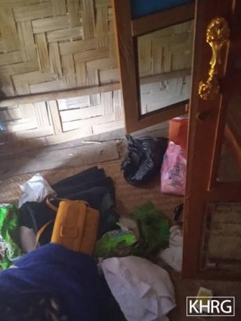 These photos were taken on October 9th 2022 in I--- village, Way Htoo area, Daw Hpa Hkoh Township, Taw Oo District. The photos show the damage to displaced villagers’ property, including a box of books, clothes, a wardrobe and a drinking water pot. [Photos: KHRG]