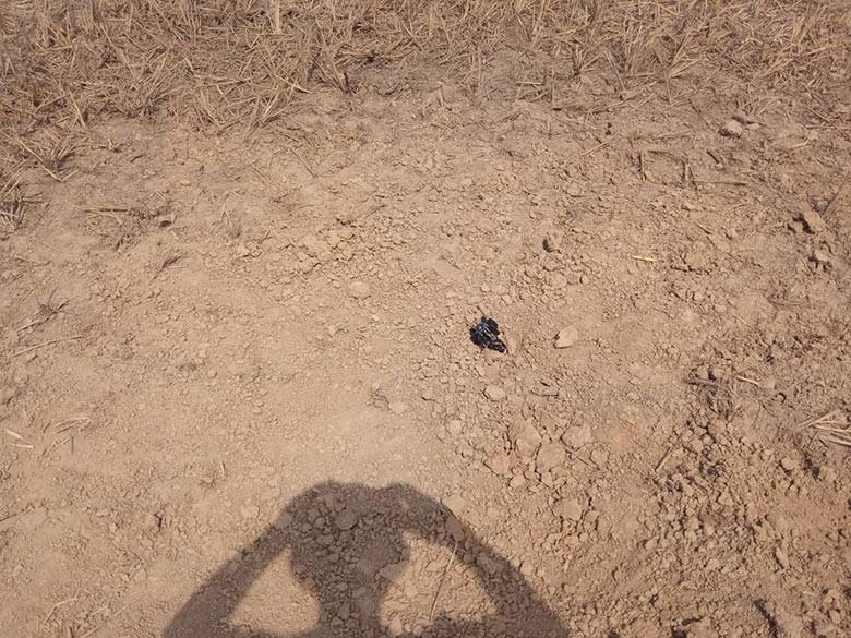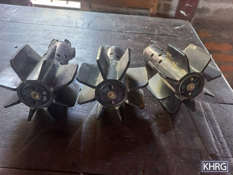 These photos were taken on February 3rd 2023 in D--- village, Hper Htee village tract, Htaw Ta Htoo Township, Taw Oo District. The left photo shows exploded mortar shells that villagers collected and put in their house [Photo: KHRG]. The right photo shows one of the mortar shells that fell into a rice field, nearby the village [Photo: local villager].
