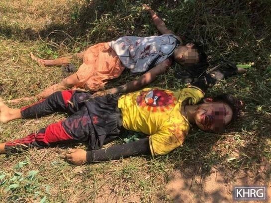 This photo was taken on April 19th 2023 in Ee--- area, Per Htee area, Htaw Ta Htoo Township, Taw Oo District. This photo shows the corpse of two villagers that were shot and killed by SAC LID #22 on April 7th 2023. [Photo: KHRG]