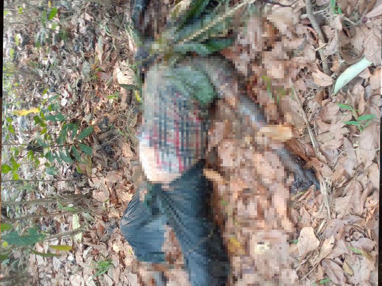 This photo was taken in June 2022 by a local villager in H--- village, Aee Soo Hkee village tract, Bilin Township, Doo Tha Htoo District. This photo shows the corpse of Saw P--- in a jungle near H--- village. [Photo: villager]