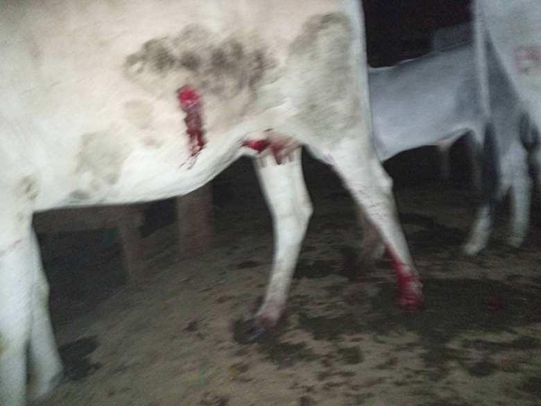The photo on the top left shows villagers’ rice mixed with chillies and turmeric by the SAC [so that villagers are unable to eat it]. The photo on the top right shows a villager’s house damaged by the SAC shelling in Nah Tha Kway village tract, Moo Township. The two photos at the bottom show a villager’s cows injured from mortar shrapnel. The two photos at the top were taken by KHRG on March 28th 2023. The two photos at the bottom were received from a Kler Lwee Htoo District KNU researcher on March 28th 2023. [Photos: KHRG/KNU]