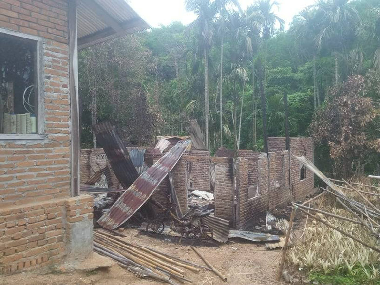 These photos were taken the first week of July 2023 in T'See Ther Mee Lar Town, Daw Hpa Hkoh Township, Taw Oo District. It shows the body of Saw W---, who was killed by the SAC, as well as burned houses after the skirmish happened between SAC and PDF on July 7th 2023. [Photos: Local villager]