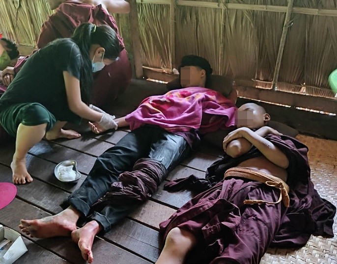 This photo was taken on May 27th 2023 in Ce--- village, Shwe Yaw Pya village tract, Tha Htoo Township, Doo Tha Htoo District. It shows one boy and one novice monk who were injured when SAC Artillery Unit #314 shelled mortars into a monastery compound. [Photo: Local villager]