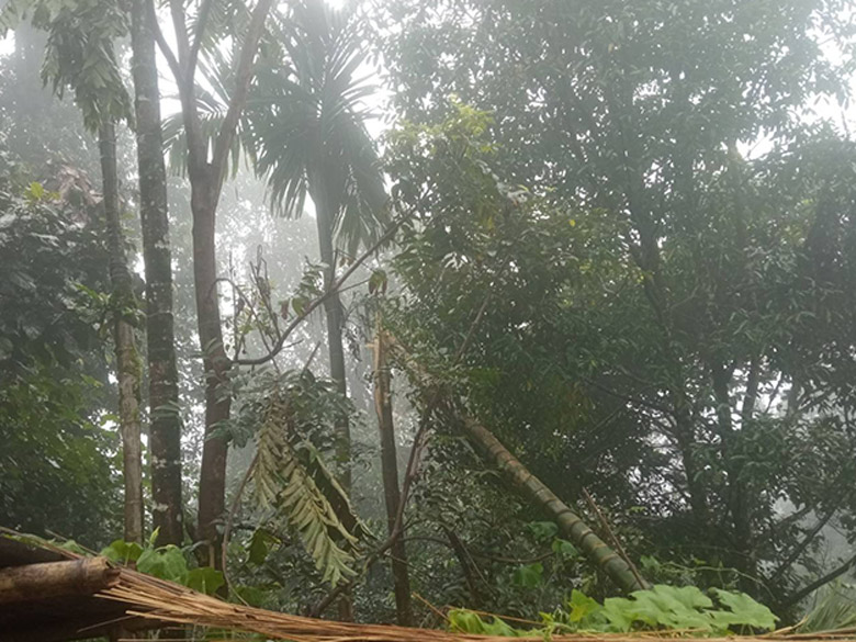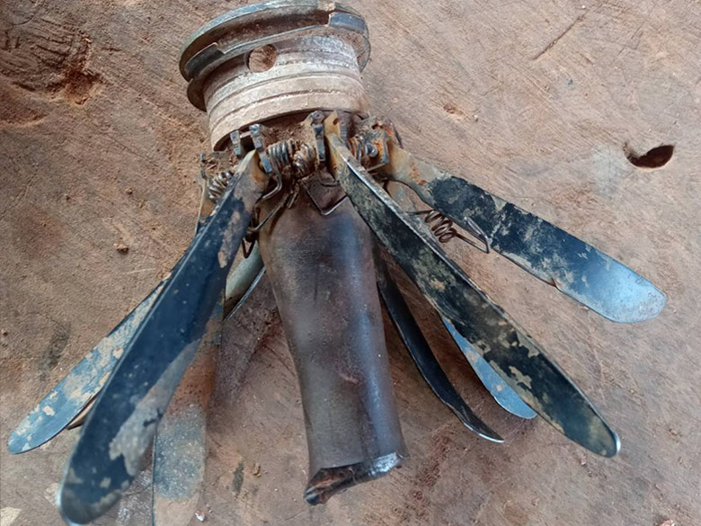 A KHRG researcher received these photos on December 12th 2023 from a local Karen National Liberation Army (KNLA)[7] soldier, in Htee Thar Saw village tract, Daw Hpa Hkoh Township, Taw Oo District. The left photo shows a remnant of an exploded bomb dropped by the SAC when they conducted air strikes in A--- village on September 10th 2023. The right photo shows a betel nut plantation which was damaged by the air strikes. [Photos: local KNLA]