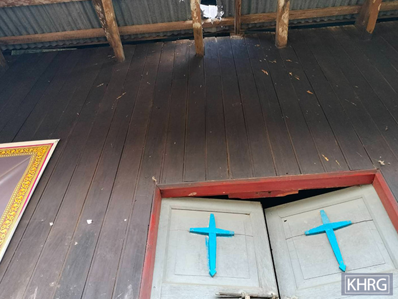 These two photos were taken on December 12th 2023 in A--- village, Htee Thar Saw village tract, Daw Hpa Hkoh Township, Taw Oo District. The left photo shows a church damaged by the SAC air strike on September 10th 2023 in A--- village and the right photo shows a local school damaged by the SAC air strike in A--- village. [Photos: KHRG]