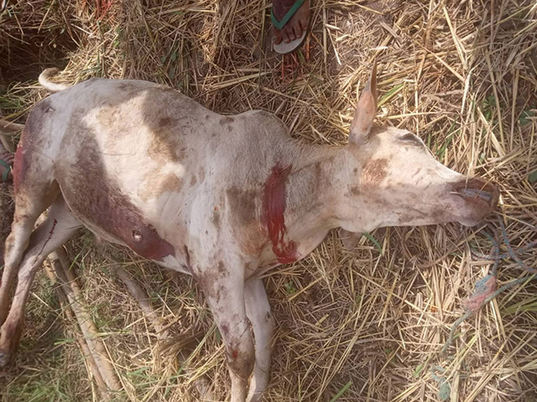 On November 17th 2023, the SAC troops indiscriminately fired mortar shells into villages in Day Loh Mu Nu village tract. One of the mortar shells landed in a farm near Ae--- village. It exploded and its shrapnel killed a cow owned by Saw Aj---. On November 19th 2023, the SAC troops again indiscriminately fired rounds of mortar into villages in Day Loh Mu Nu area. One of the mortar shells landed in a villager’s house in N--- village. It exploded and damaged the roof of the house owned by Ak---. Shrapnel from the mortar shells also hit other three houses nearby, damaging them.