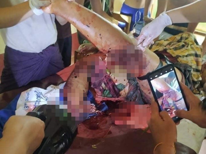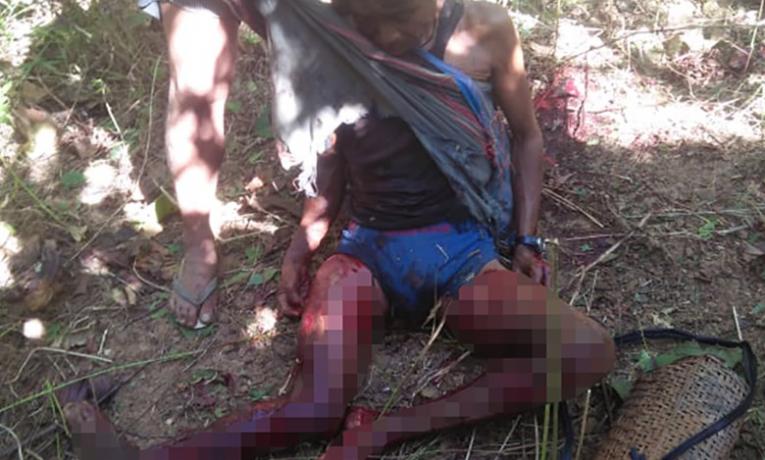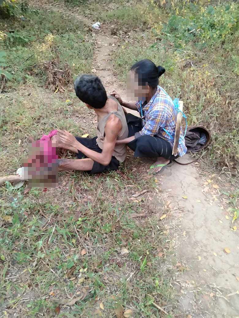 This photo was taken on January 9th 2022 in Z--- village, Meh Klaw village tract, Bu Tho Township. It shows a 55-year-old villager, Saw Aa---, shortly after he was seriously injured by a landmine explosion. Saw Aa--- was harvesting Daw Ka Tha (Oroxylum indicum, a type of flowering plant used in traditional medicine) to secure a livelihood for his family when he was injured by the landmine. Both of his legs were badly injured due to the landmine explosion. He was sent to the Military Operations Command (Byu Ha) Hospital in Hpapun Town. He passed away immediately after arriving at the hospital, without receiving treatment. [Photo: Local villager]