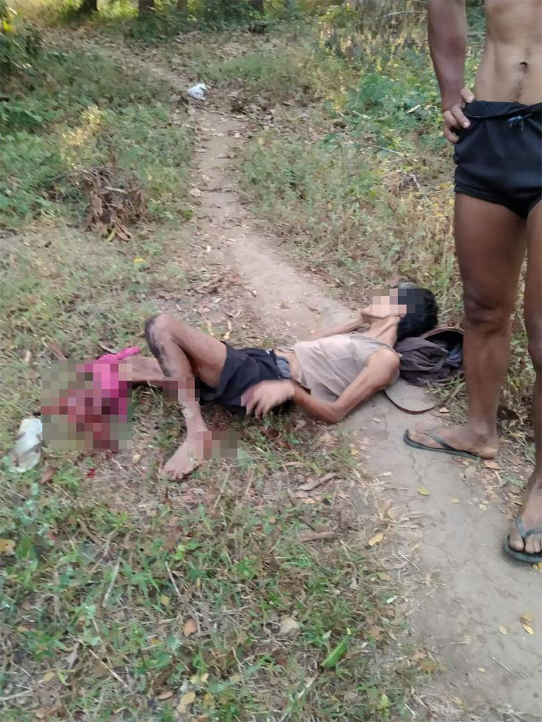 These photos were taken on March 1st 2021 in K--- village, Kheh Kah Hkoh village tract, Ler Doh (Kyaukkyi) Township. They show the bodies of two villagers who were killed by a landmine explosion. At 7:30 am on March 1st 2021, 24-year-old Saw L--- and 19-year-old Naw M---, from K--- village, were hit by a landmine explosion when they were travelling together to Ler Doh Town by motorbike to purchase goods for their shop. They were killed instantly by the explosion. Another villager travelled with them on another motorbike, Saw N--- (18 years old) and sustained minor injuries.[18] [Photos: Local villager]