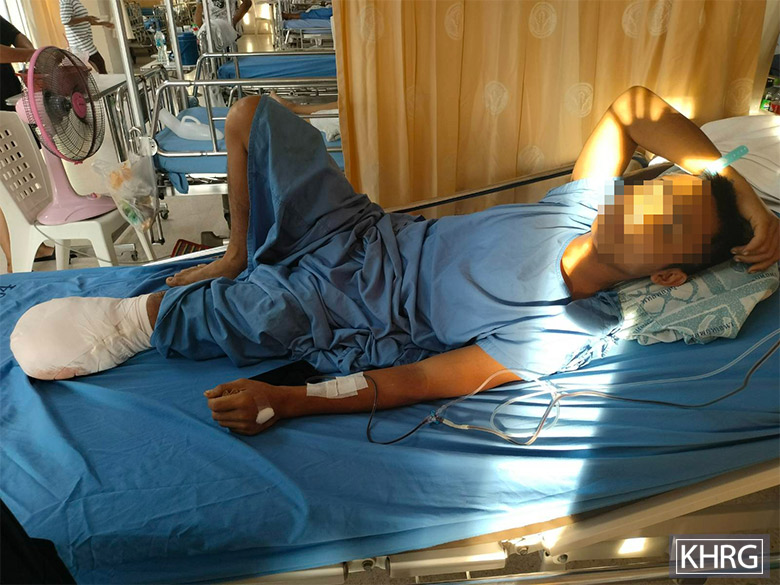 This photo was taken on October 16th 2023. It shows Saw T---, a 19-year-old villager from U--- village, Sa Tain village tract, Ler K’Hsaw Township, recovering in a hospital from injuries sustained by a landmine explosion. On October 15th 2023, Saw T--- was asked to accompany KNLA soldiers on a military operation in Ler K’Hsaw Township as he had some medical knowledge. During the operation, as Saw T--- was helping to carry the body of a KNLA soldier (who was killed by a sniper attack from the Kawthoolei Army (KTLA)[20]) to a KNU district office in the area, Saw T--- stepped on a landmine, at Yin Kweh Taung place, Hseh Phyu Taing village tract, K’Hser Doh Township, injuring his leg. He was taken for hospital treatment in K--- town, Thailand. His left leg had to be amputated due to the injuries sustained.[21] [Photo: KHRG]